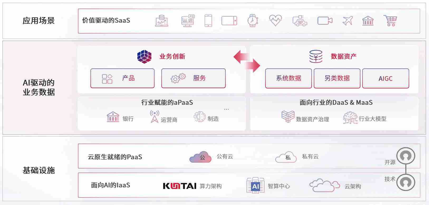 数字时代,,,,围绕企业数字化转型的关键要素,,,PG娱乐数码开创性的提出数云融合战略和技术体系框架,,,,着力在云原生、、数字原生、、、AI原生和信创产业上架构产品和服务能力,,,为处在不同数字化转型阶段的快消零售、、、汽车、、金融、、医疗、、、政企、、教育、、运营商等行业客户提供泛在的敏捷IT能力和融合的数据驱动能力,,,,构建跨界融合创新的数字业务场景和新业务模式,,,助力企业级客户建立面向未来的核心能力和竞争优势,,,全面推动社会的数字化、、智能化转型升级。。。。